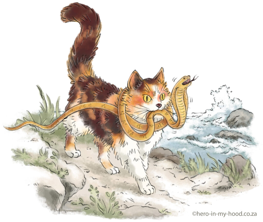 One day I heard the strangest growling outside. I peeked through the window, and there she was – sashaying along the path with King Tut hanging over her shoulders like a scarf! His golden body wriggled and wriggled, but she held on with her sharp little teeth.