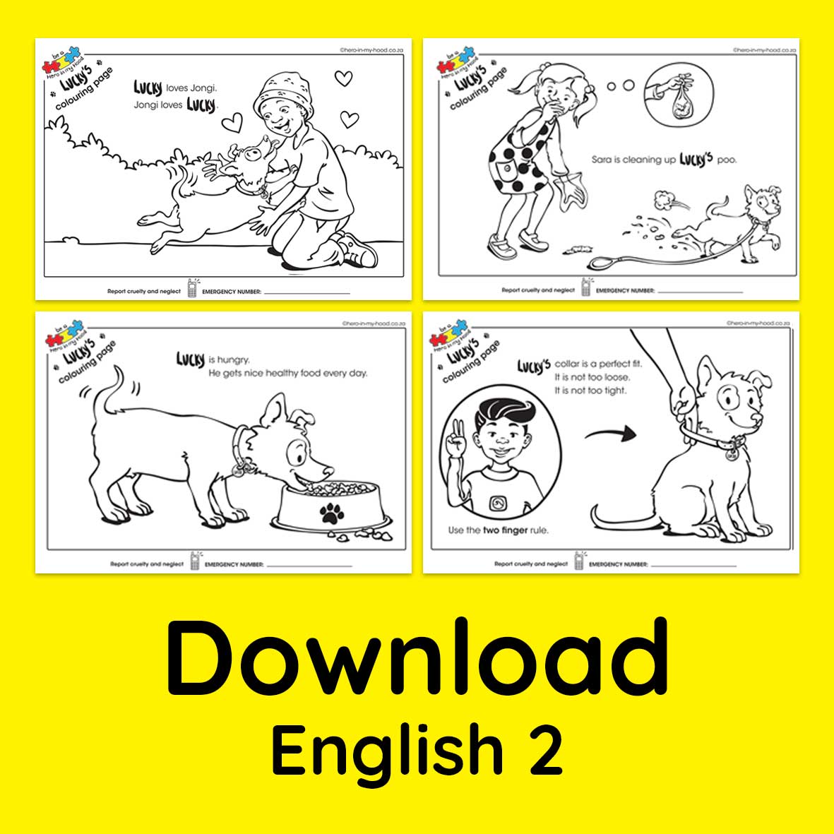Each page has a line to fill in an emergency animal welfare number, filling it in will ensure the children remember it and are able to call when they are concerned about their own pet or witness neglect and cruelty. English All our material is copyrighted and cannot be used for resale or for commercial purposes. Once you have paid and downloaded the pdf files you have a Standard Licence to print and hand out up to 1000 copies. For prints thereafter please contact us for a Premier Licence. [btn text="Back to Lucky's colouring book product page" tcolor=#FFF bcolor=d33d46 thovercolor=#FFF bhovercolor=00bff3 link="https://www.hero-in-my-hood.co.za/shop/animal-welfare-products/luckys-colouring-book-product-page/" target="_self"]